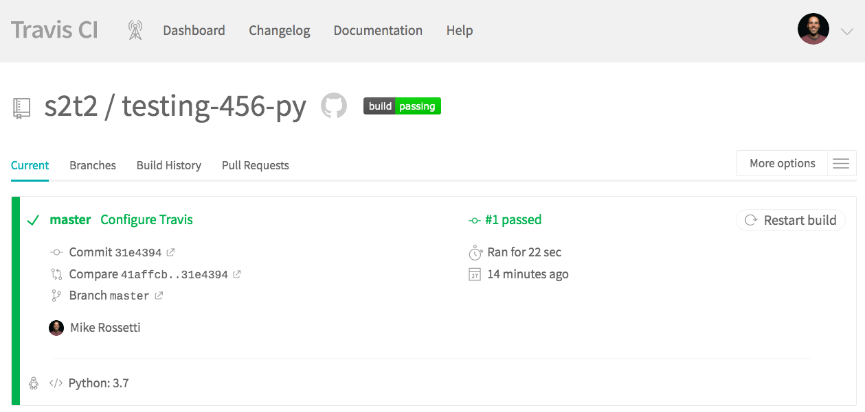 This push should now trigger the execution of automated tests on the CI server. Visit your repository's CI "builds" at a URL like https://travis-ci.com/GITHUB_USERNAME/GITHUB_REPONAME to see the results of the automated tests and verify Travis has been configured properly: