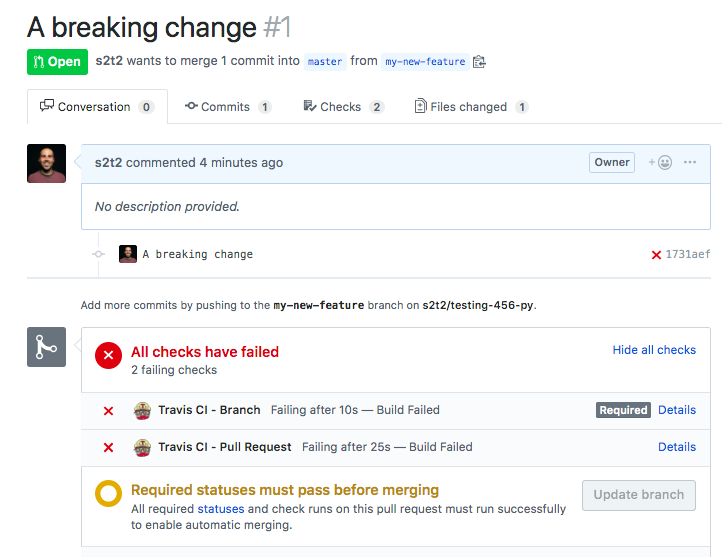 To make use of the more helpful aspects of the GitHub and Travis CI integration, let's practice a workflow involving branch operations and Pull Requests.