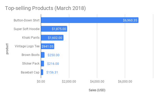A list of the top selling products, and total monthly sales for each, formatted as USD with a dollar sign and two decimal places (e.g. "Button-Down Shirt: $6,960.35", "Super Soft Hoodie: $1,875.00", etc.).
